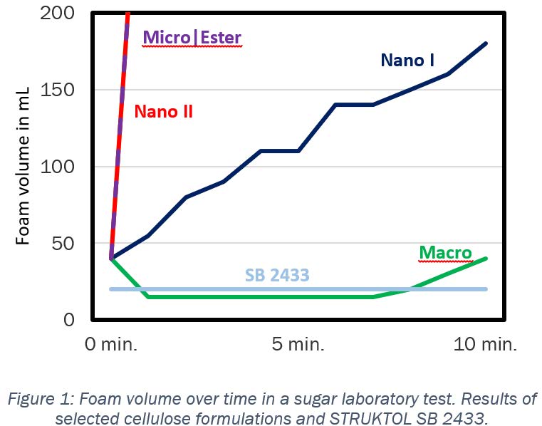 The aim of this project was the development of a biobased and biodegradable antifoam. A sugar factory uses a substantial amount of antifoam during beet sugar production. Most commonly those consist of fossil or silicone raw materials. Despite the growing demand for sustainable and biodegradable, plant-based alternatives, their foam-breaking performance remains inadequate compared to commercial products. The joint project “BIO-DEFOAM” aims to develop a sustainable and effective alternative to the fossil-based antifoams. Cellulose is a renewable and sustainable raw material. The possibility to functionalize cellulose is already being utilized in the chemical industry, making it one of the most consumed renewable polymer. A first batch of antifoam was produced by Frauenhofer IAP based on the syntheses given in the literature (Z. Hu et al. ACS Sustainable Chemistry & Engineering 5 (2017), 5018). Antifoaming capacity of the nanocrystalline cellulose functionalised with tannic acid were tested in a wide range of applications. Especially during the sugar test at elevated temperatures (70°C/158°F), the nanocrystalline cellulose antifoam performed very well, even comparable to commercial products from Struktol (Figure 1. Nano I). Further modifications of the cellulose have been synthesized and tested for their antifoaming capabilities. In a first step the nanocrystalline cellulose was replaced by cheaper micro- & macrofibre cellulose. Secondly, the functionalization with different vegetable oil was tested, in order to eliminate critical chemicals and ease upscaling into industry size (Figure 1. Nano II). The antifoaming capabilities of those formulations with different combinations of cellulose and methods of functionalization can be found in Figure 1. The graphic displays the foam generation in mL by fumigation of air into a solution consisting of water, sugar and saponin. It can be seen, that the bio defoamer based on macro cellulose and functionalized by esterification performs as well as the already commercially available product STRUKTOL SB 2433. The antifoaming capacity of selected bio defoamers based on modified cellulose was found to be in the range of already available products based on fossil raw materials. It remains to be seen if an industrial implementation of the bio defoamers can be viable.